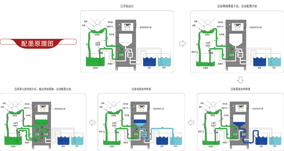 配墨功能:按照预设原墨与溶剂比例调配油墨